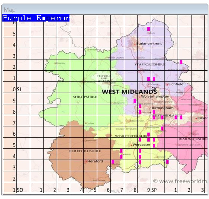 National Status: Very much a south east distribution was extinct from the West Midland with just a few sightings each year. Since introductions in Warwickshire more have been seen. However this is still a BAP species and nationally it shows a downward trend. Recent sightings, Grafton Wood, Weethley Wood and Tiddesley Wood and in a garden in Malvern.