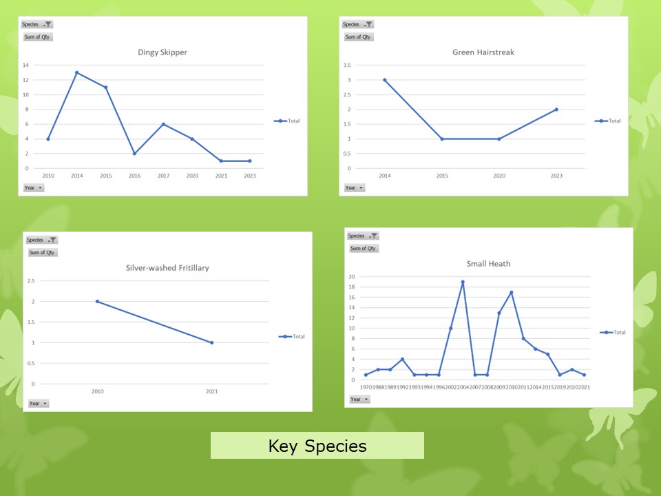 The key Species are: Dingy Skipper, Silver-washed Fritillary, Small Heath, Purple Hairstreak, Green Hairstreak, White Letter Hairstreak.