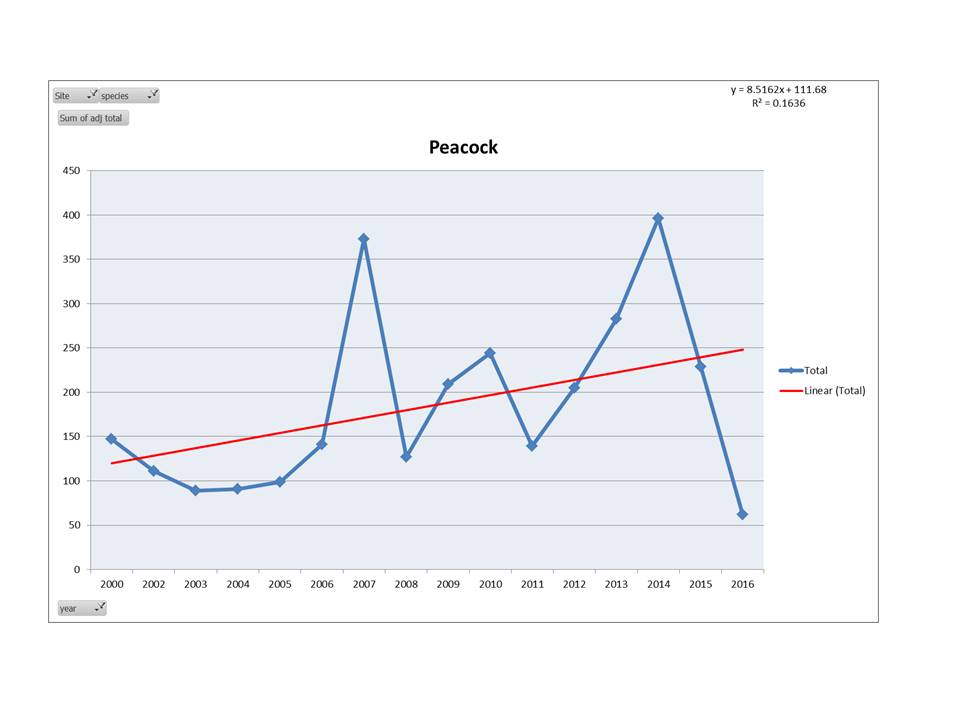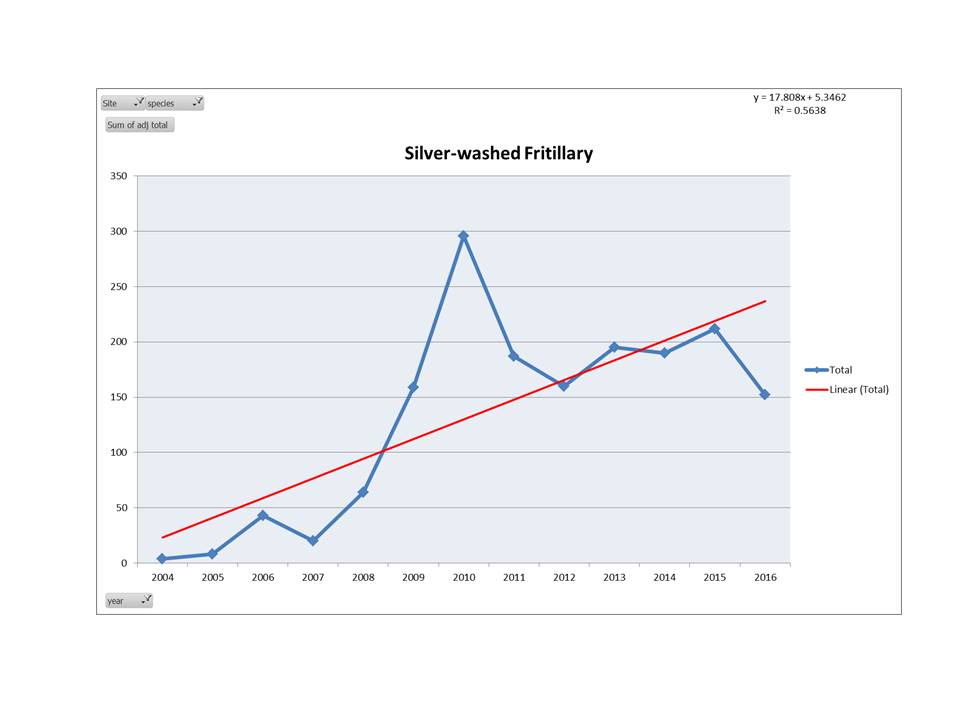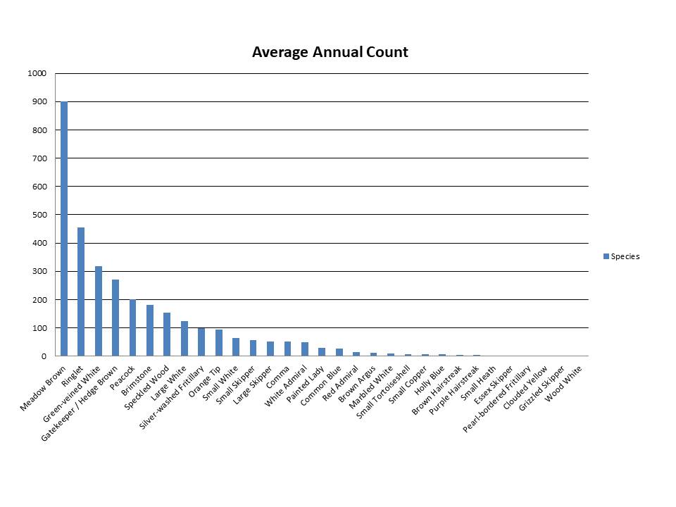 Grafton Wood has 31 species of Butterfly identified counted by weekly Transect counts over the 17 years. The average yearly count is 3200 butterflies and a peak of 4800