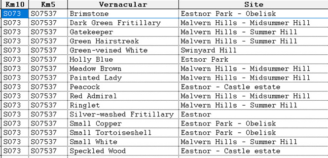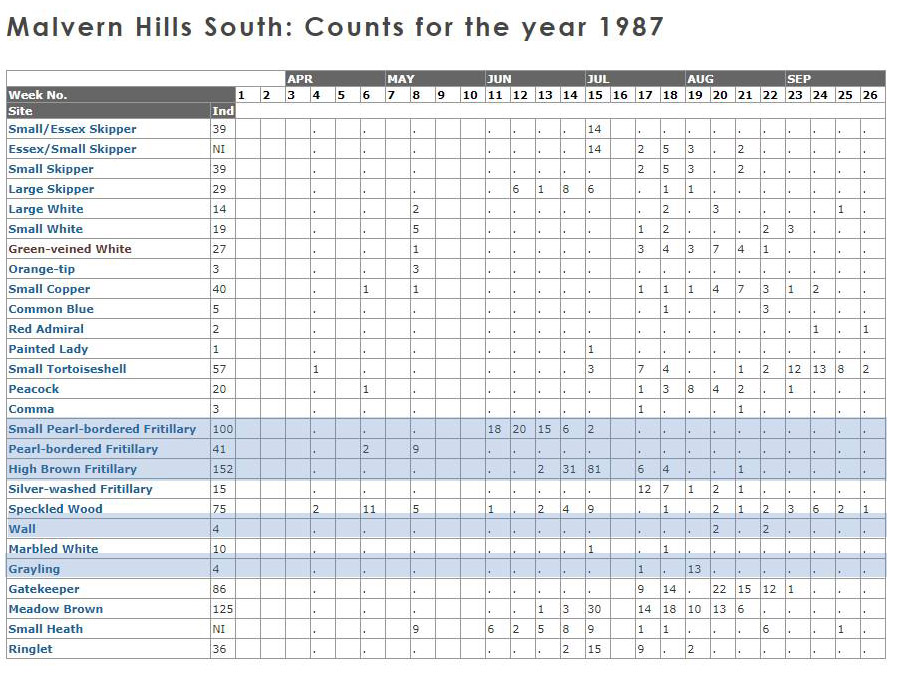 The map above shows the original South Malvern Transect and the table to the upper right shows the results. The table lower right shows the later Eastnor transect – the last place where High Brown Fritillaries were recorded.